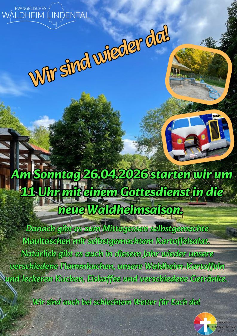 Am Sonntag, 26.04.2026 beginnen wir um 11 Uhr die neue Waldheimsaison mit einem Gottesdienst. Danach gibt es zum Mittagessen selbstgemachte Maultaschen mit selbstgemachtem Kartoffelsalat.